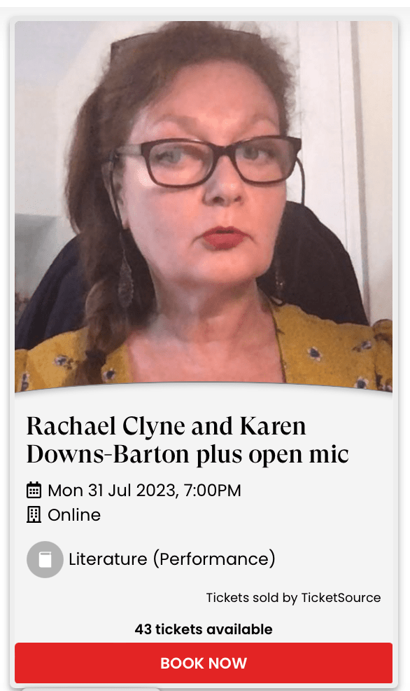 I’m delighted to be reading a selection of poems from my book, Didicoy, at the Cheltenham Poetry Festival event on Monday, July 31st alongside the fantastic Rachael Clyne. The event will be live-streamed at 7.30 and tickets are available via TicketSource (link also in image). Didicoy has been announced as the Poetry Book Society recommendation for summer 23. Woo hoo!