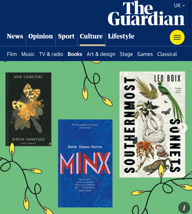 I’m super excited to announce that Minx has made it into the pages of the Guardian newspaper as one of Rishi Dastidar’s ‘Best Poetry of 2025’. Here’s what Rishi had to say about her… ‘Karen Downs‑Barton’s debut /Minx/ (Chatto & Windus) was similarly eye-catching, unsparingly detailing both the poet’s time in the care system, and the wider discrimination she experienced coming from an Anglo-Romany background. Her use of Roma language in her poems adds an unexpected lushness to the often bleak content.’
