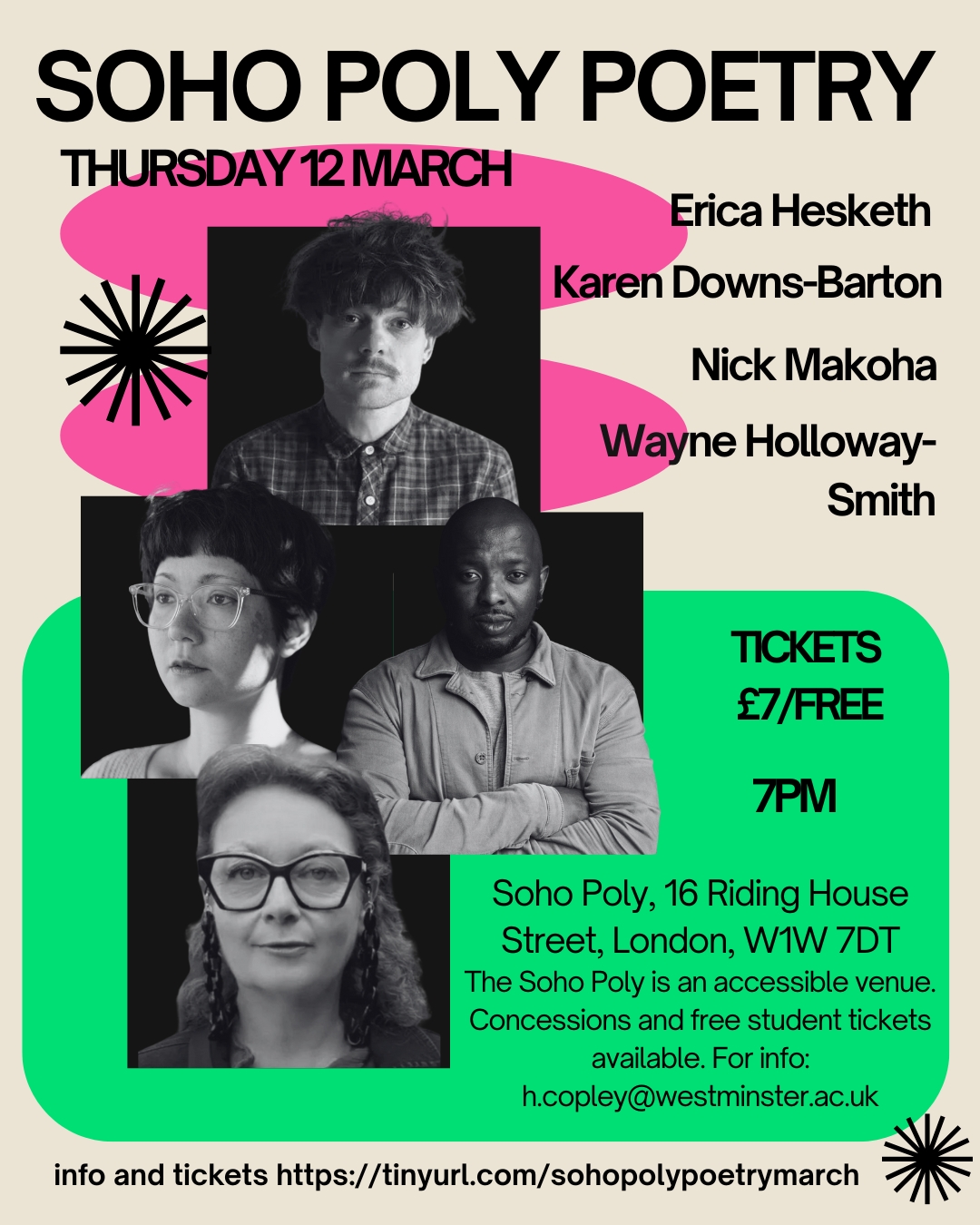 Join us at the Soho Poly for an electrifying night of poetry. In the fourth event of the 25/26 series, we’re excited to welcome Erica Hesketh, Karen Downs-Barton, Wayne Holloway-Smith and Nick Makoha